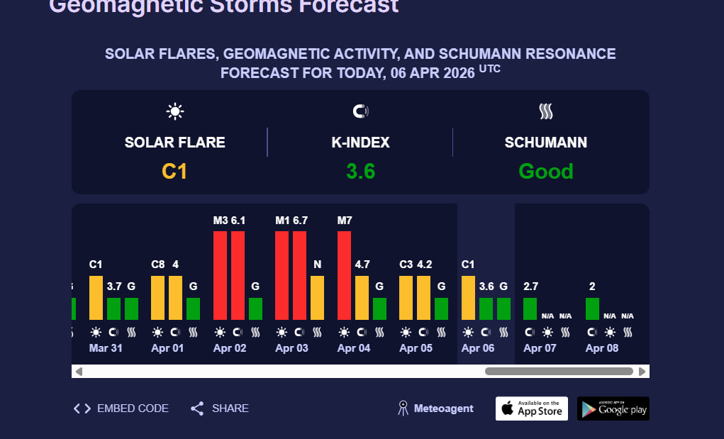 Bu ko‘rsatkich geomagnit fon normal ekanini bildiradi va kuchli bo‘ron xavfi yo‘qligini anglatadi. Quyosh faolligi ham nisbatan past darajada. Bugungi kunda quyosh chaqnashi «C1» darajasida baholangan. Bu esa kuchsiz quyosh faolligiga kiradi va Yerga sezilarli ta’sir ko‘rsatmaydi. Shuman rezonansi esa «yaxshi» holatda bo‘lib, umumiy fon barqarorligini tasdiqlaydi.