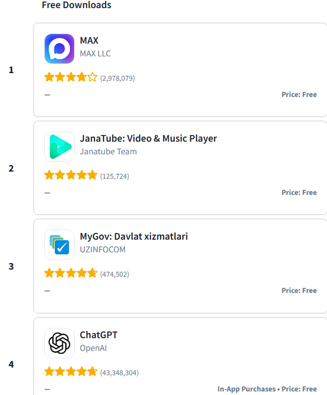 Sensor Tower tahliliy platformasi ma’lumotlariga ko‘ra, 2026-yil 7-aprel holatiga ko‘ra MAX messenjeri O‘zbekistonda Play Market orqali eng ko‘p yuklab olingan ilova bo‘ldi.