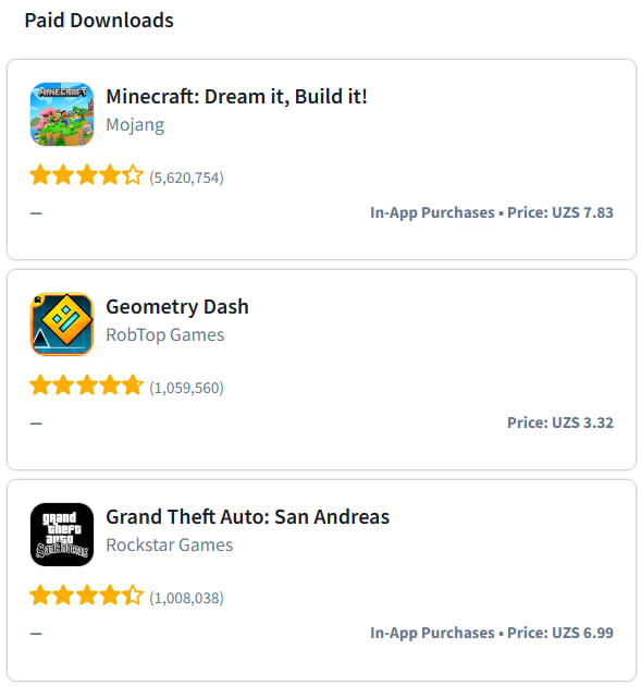 Pulli ilovalar segmentida Minecraft mobil o‘yini yetakchilik qilmoqda. Undan keyingi o‘rinlarda Geometry Dash va GTA: San Andreas o‘yinlari qayd etilgan. Ta’kidlash joizki, MAX messenjeri App Store platformasida yuklab olishlar soni bo‘yicha hozircha 7-o‘rinda bormoqda.