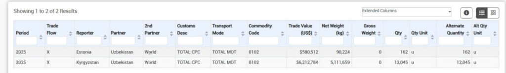 Qirg‘izistondan esa asosan yirik qoramol import qilinadi. 2025-yil yanvar–fevral oylarida Qirg‘iziston O‘zbekistonga 11,2 ming bosh qoramol eksport qilgan. Yil yakuniga ko‘ra esa jami 5 ming tonna mahsulot yetkazib berilgan.