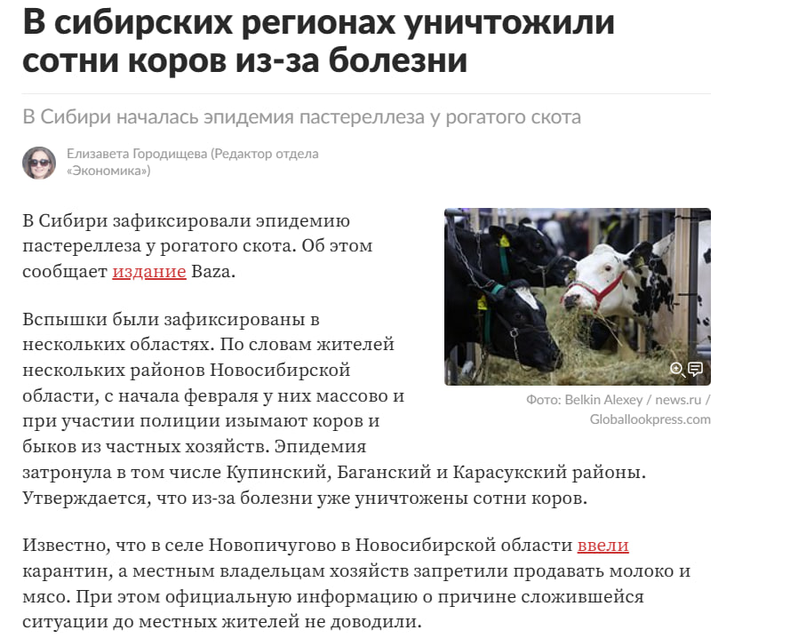 Rossiyaning Novosibirsk viloyati va boshqa hududlarda aholi ommaviy so‘yishga qarshi norozilik bildirgan. Rasmiy tushuntirishga ko‘ra, bu choralar xavfli infeksiyalar tarqalishining oldini olish uchun amalga oshirilmoqda. Ammo ko‘pincha kasallik nomi ochiqlanmaydi.