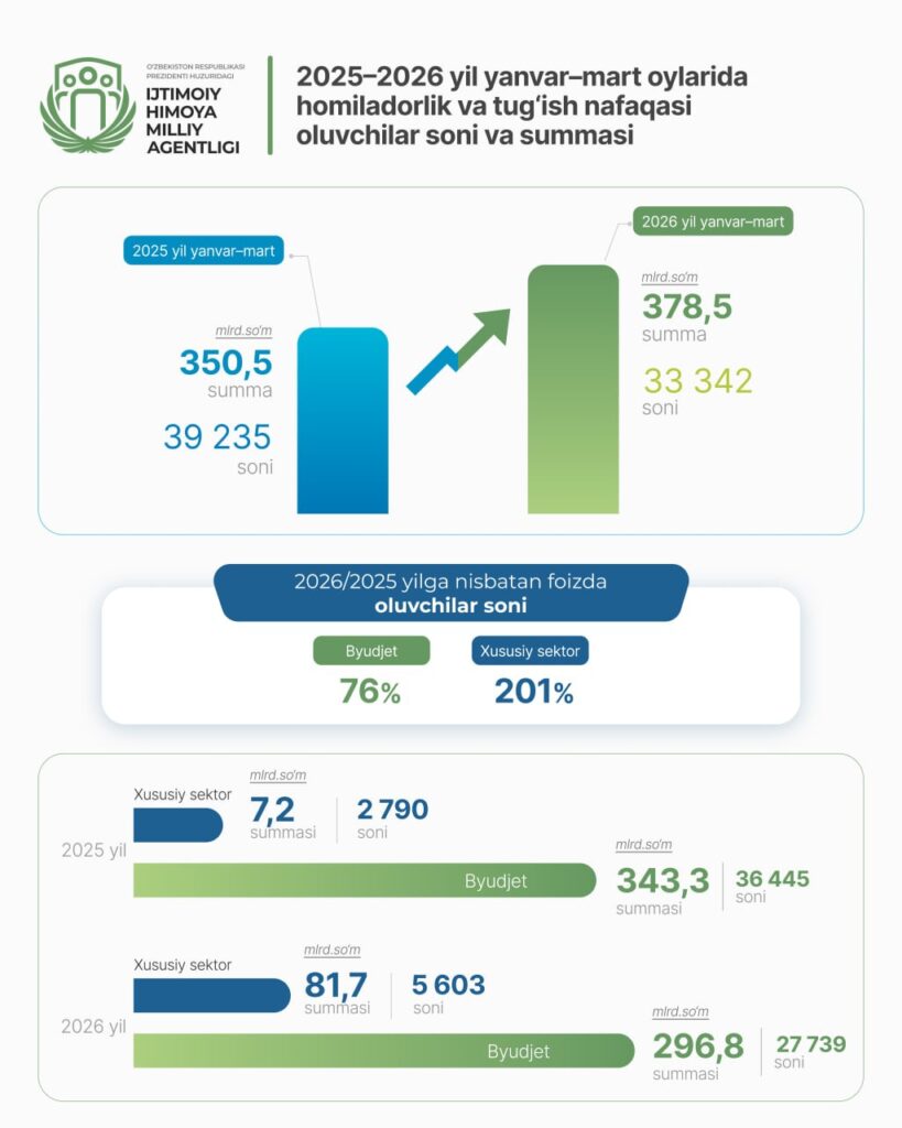 Xususiy sektorda ham sezilarli o‘sish kuzatilgan. Agar 2025-yil 1-choragida 2,8 ming nafar ayol nafaqa olgan bo‘lsa, 2026-yilda mazkur ko‘rsatkich 2 baravar oshib, 5,6 ming nafarga yetdi. Xususiy tashkilotlarda ishlovchi ayollarga 2025-yilda 7,2 mlrd so‘m to‘langan bo‘lsa, 2026-yilda bu ko‘rsatkich 11,3 baravar o‘sib, 81,7 mlrd so‘mga yetgan.