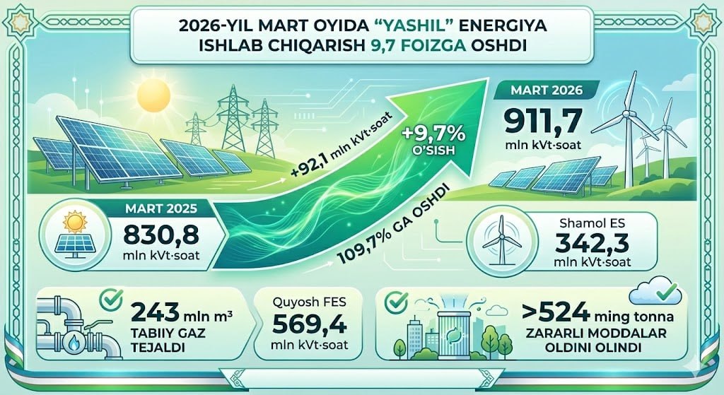 2026-yil mart oyida O‘zbekistonda «yashil» energiya ishlab chiqarish hajmi 9,7 foizga oshib, yirik quyosh va shamol elektr stansiyalari tomonidan jami 911,7 mln kVt/soat elektr energiyasi ishlab chiqarildi. Bu haqda Enegetika vazirligi xabar bermoqda.