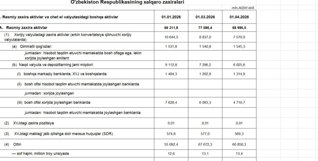 Shu bilan birga, oltin zaxiralari ham pasaydi. Mart oyida $67,7 mlrd bo‘lgan oltin qiymati aprel boshida $60,8 mlrdga tushdi. Biroq oltinning jismoniy hajmi oshishda davom etdi va 13,4 mln unsiyaga yetdi.