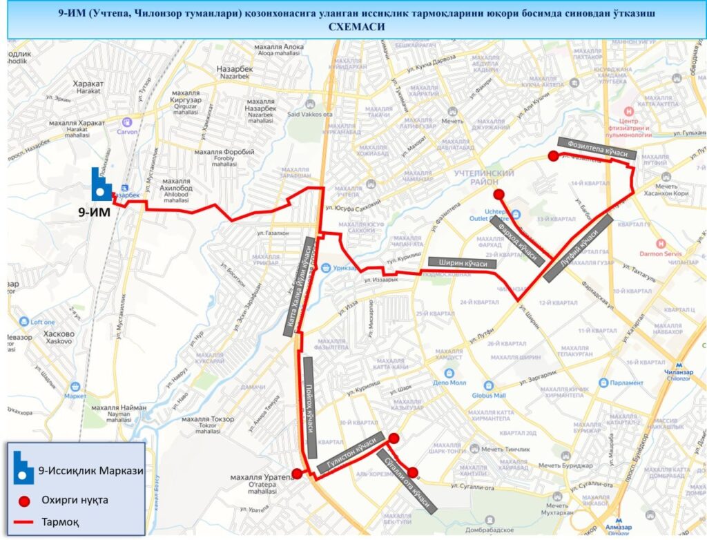 «9-IM» qozonxonasi boshqaruvidagi issiqlik tarmoqlari quyidagi ko‘chalarni qamrab oladi: Taqachi, Guliston, Shirin, Lutfiy, Katta halqa yo‘li, O‘rikzor, Katta Xirmontepa, Kichik halqa yo‘li, Beshqayrag‘och, To‘qimachi, Nashriyot, Yusuf Sakkokiy, Foziltepa, Farhod ko‘chalari, Sharq, Al-Xorazmiy-1,2, Beshqayrag‘och, Guliston, Izza dahalari, Chilonzor dahasi 7, 13 – 15, 21 – 25, 30, 31-mavzelari hamda O‘rikzor bozori hududi.