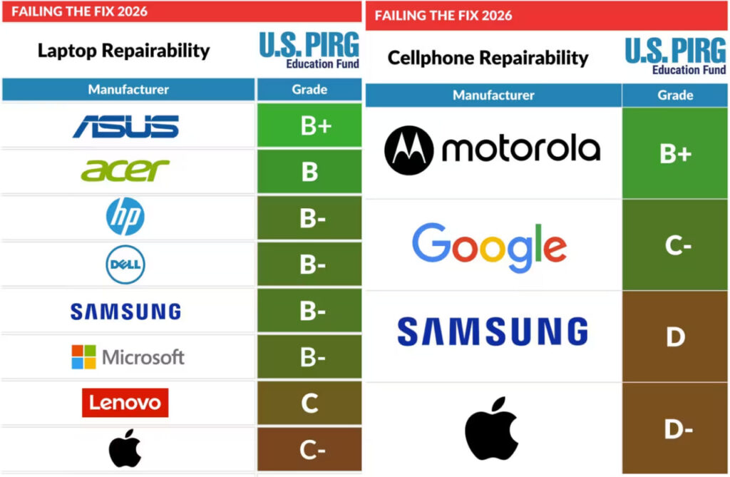 Hisobotda noutbuklar ham baholandi. Apple MacBook C- baho olib, eng past natijalardan birini qayd etdi. Lenovo ham past ko‘rsatkich bilan chiqdi.