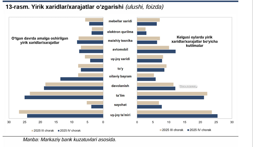 Markaziy bank kuzatuvlariga ko‘ra, kelgusi davr uchun ham xarajatlar oshishi bo‘yicha kutilmalar yuqori darajada saqlanmoqda. Respondentlarning 76 foizi yaqin oylar ichida xarajatlari ortishini bildirgan. Bu esa iste’mol faolligi pasaymaganini ko‘rsatadi. Ushbu so‘rovnomada 4,1 mingdan ziyod respondent qatnashgan.