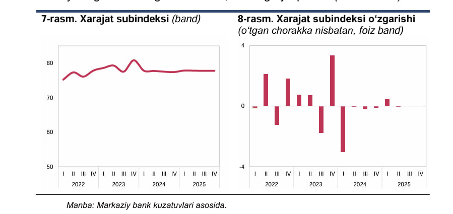 O‘zbekistonda aholi xarajatlari barqaror yuqori darajada qolmoqda. 2025-yil IV chorak yakunlariga ko‘ra, xarajatlar subindeksi 77,8 bandni tashkil etdi va o‘tgan chorakka nisbatan deyarli o‘zgarmadi. Shu bilan birga, bu ko‘rsatkich o‘tgan yilning mos davriga nisbatan 0,4 bandga oshganini ko‘rsatmoqda.