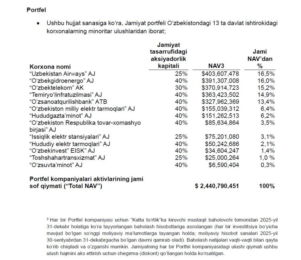 2025-yil 31-dekabr holatiga ko‘ra, UzNIF’ning portfel kompaniyalaridagi ulushlarining jami sof aktivlari qiymati (Total NAV) 2,44 mlrd dollarni tashkil etadi. Portfel 13 ta yirik davlat korxonalaridagi minoritar ulushlarni o‘z ichiga oladi.