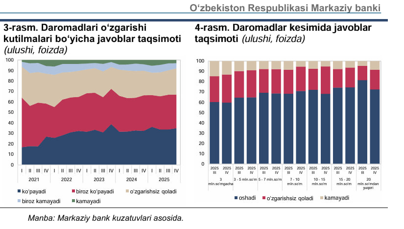 Daromadlar oshishi bo‘yicha optimizm deyarli barcha daromad guruhlarida saqlanib qolmoqda. Ayniqsa, 7–10 mln so‘m daromadga ega qatlamda ijobiy kutilmalar biroz oshgan. Shu bilan birga, 20 mln so‘mdan yuqori daromad oluvchi guruhda kutilmalar biroz pasaygan.