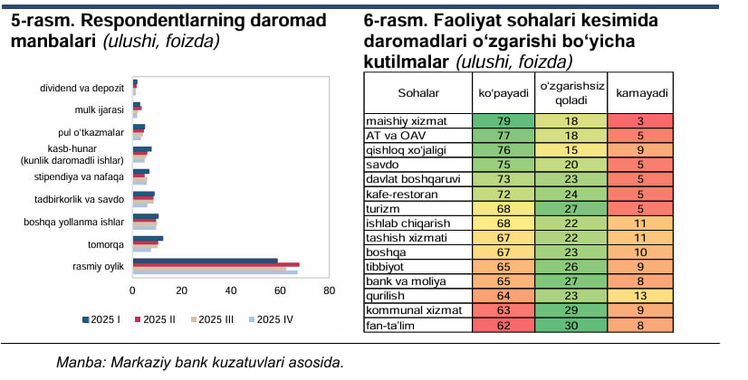 Boshqa daromad manbalari orasida tadbirkorlik, savdo va qo‘shimcha ishlar qayd etilgan. Soha kesimida esa maishiy xizmatlar, axborot texnologiyalari, qishloq xo‘jaligi, savdo va umumiy ovqatlanish yo‘nalishlarida daromadlar oshishi bo‘yicha yuqori optimizm kuzatilmoqda. Bu xizmatlar sektori va turizm rivojlanishi bilan izohlanadi.