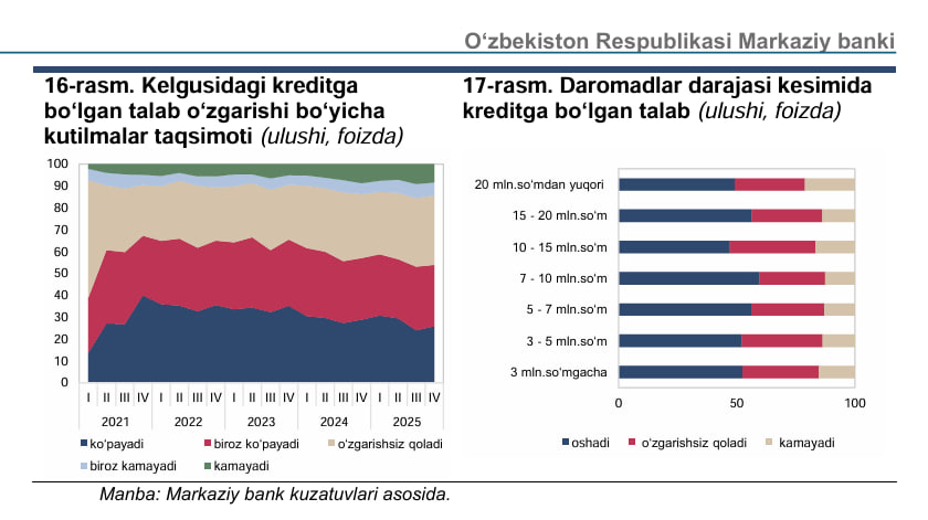 Markaziy bank tomonidan e’lon qilingan iste’mol kayfiyati sharhiga ko‘ra, O‘zbekistonda eng ko‘p kreditni 7–10 mln so‘m daromadlilar olmoqda. Daromadi 20 mln so‘mdan yuqori bo‘lgan respondentlar orasida esa kreditga ehtiyoj biroz kamaygan.
