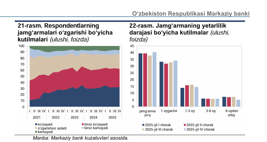 So‘rov natijalari aholining moliyaviy kelajakka nisbatan ishonchi saqlanib qolayotganini ko‘rsatmoqda. Respondentlarning 62,6 foizi kelgusida jamg‘armalari oshishini kutmoqda. Shu bilan birga, jamg‘armalari o‘zgarishsiz qolishini bildirganlar ulushi 24,2 foizga yetdi. Jamg‘armalari kamayishini kutayotganlar esa 13,2 foizni tashkil etib, bu ko‘rsatkich biroz pasaygan.