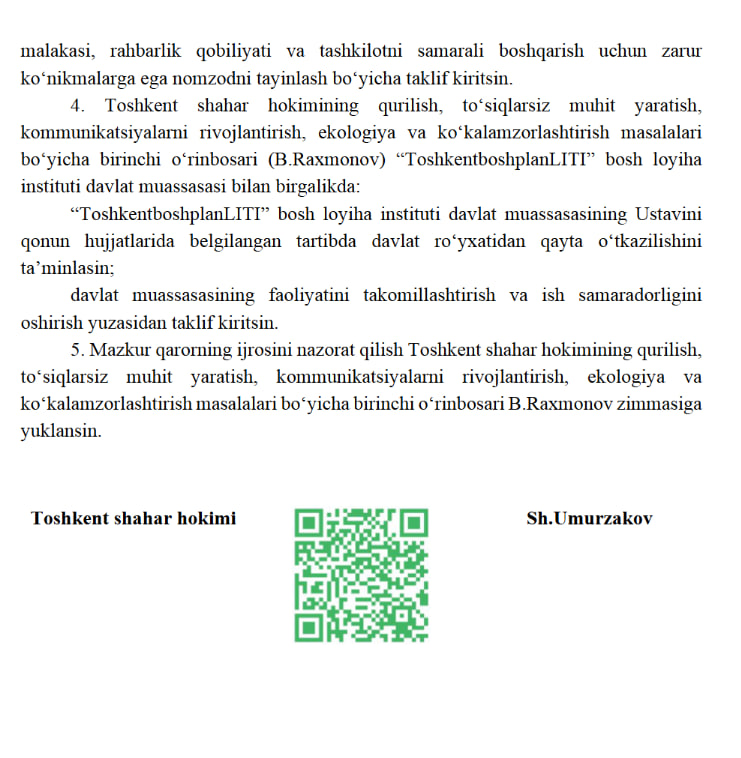 «ToshkentboshplanLTI» bosh loyiha instituti Qurilish va uy-joy kommunal xo‘jaligi vazirligi tarkibidan chiqarilib, Toshkent shahar hokimligi tuzilmasiga o‘tkazildi. Bu haqda poytaxt hokimining tegishli qarori qabul qilindi.