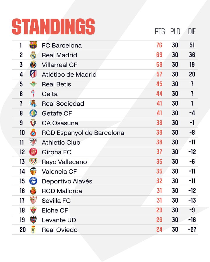 «Real Madrid» joriy La Liga mavsumida barqaror natijalar qayd etmoqda, biroq bu chempionlik uchun yetarli bo‘lmayapti. Jamoa 30 o‘yinda 22 g‘alabaga erishdi va 5 bor mag‘lub bo‘ldi. Mavsum «Real» uchun juda yaxshi boshlangan edi. Yangi bosh murabbiy Xabi Alonso qo‘l ostida jamoa dastlabki 14 o‘yinning 13 tasida g‘alaba qozondi. Bu natijalar madridliklarni chempionlik uchun asosiy da’vogar sifatida ko‘rsatgandi.