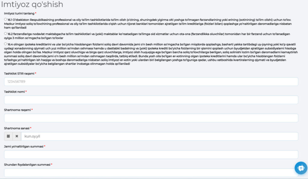 Keyingi bosqichda daromadlaringizni kiritasiz. Bu yerda asosiy ish joyingizdan olgan daromad, yil davomida hisoblangan umumiy summa, ushlab qolingan daromad solig‘i (JShDS) ko‘rsatiladi. Shundan so‘ng siz «Soliq imtiyozlari» bo‘limiga o‘tasiz.