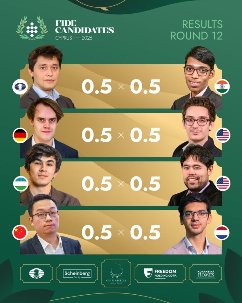 Shaxmat bo‘yicha Nomzodlar turnirining 12-turida peshqadam Javohir Sindarov dunyoning ikkinchi raqamli shaxmatchisi Hikaru Nakamura bilan durangga imzo chekdi.