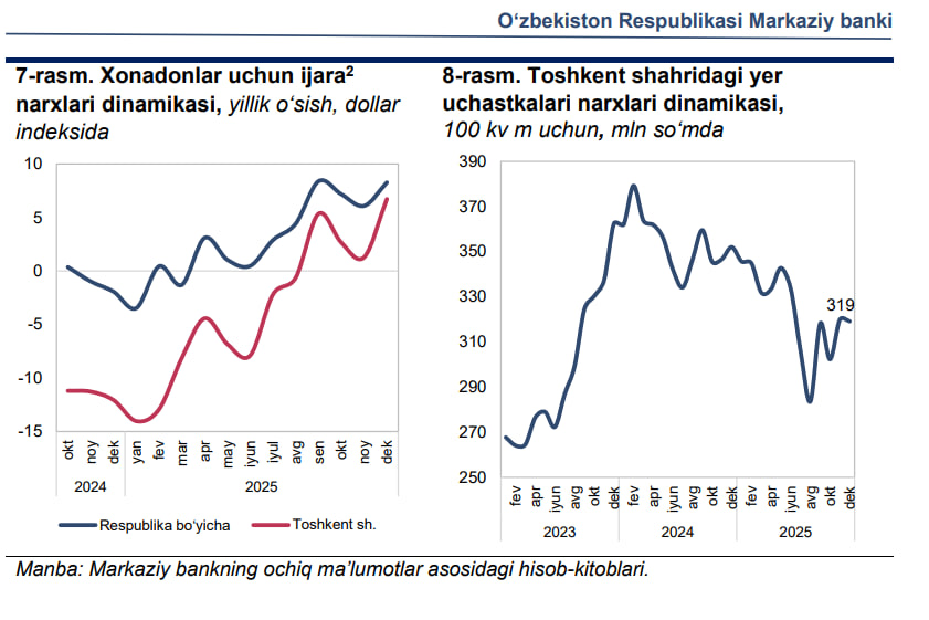 2025-yilning IV choragida Toshkentda yer uchastkasi narxi qariyb 10 foizga pasayib, 1 sotix yer narxi 319 mln so‘mni tashkil etdi. Bu haqda Markaziy bank sharhida ma’lum qilindi.