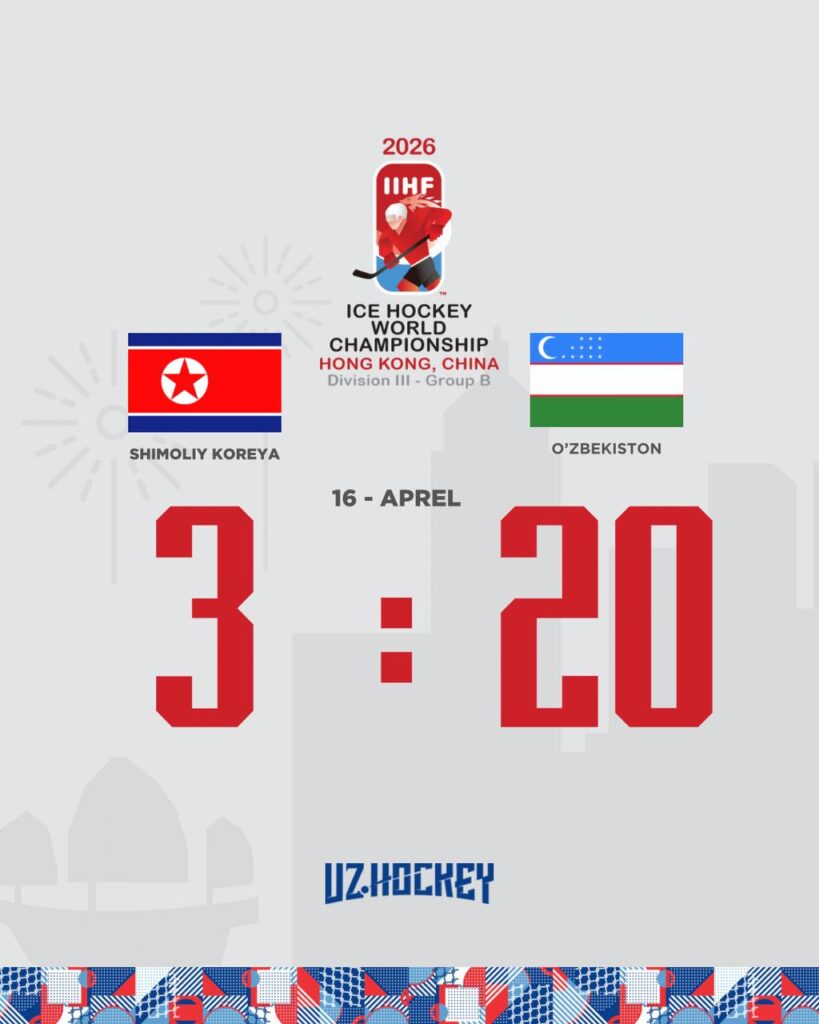 Gongkongda bo‘lib o‘tayotgan xokkey bo‘yicha 2026-yilgi Jahon chempionati III divizioni guruh bosqichi doirasida O‘zbekiston milliy terma jamoasi Shimoliy Koreyani 20:3 hisobida mag‘lub etdi.