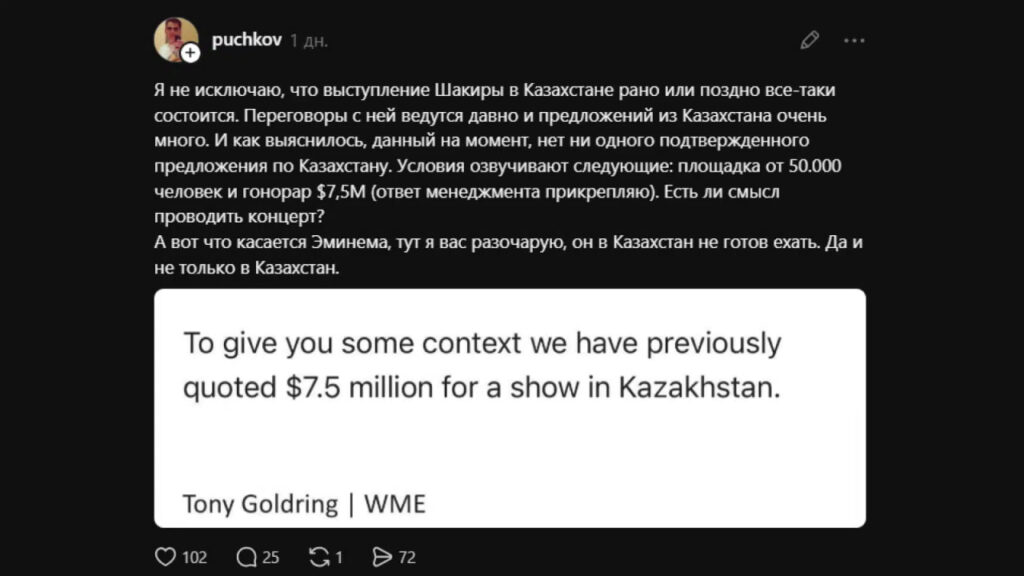 Puchkov bunday yuqori narxlar ko‘pincha mahalliy tashkilotchilar o‘rtasidagi raqobat bilan bog‘liqligini aytdi. Bu esa artistlar uchun narxni oshiradi. Eminem bo‘yicha vaziyat esa ancha murakkab. Tashkilotchining so‘zlariga ko‘ra, reper Qozog‘istonga kelishga tayyor emas. U hozir umumiy gastrol faoliyatida ham kamroq ishtirok etmoqda.