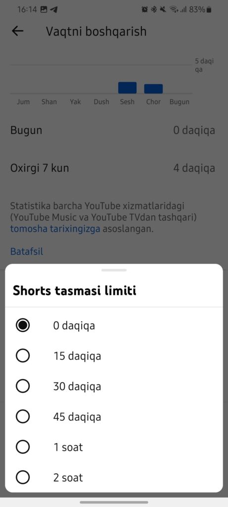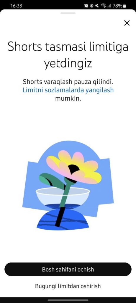 Foydalanuvchi nol daqiqalik limitni o‘rnatgach, Shorts bo‘limida videolar umuman ko‘rsatilmaydi. Buning o‘rniga ekranda «Shorts tasmasi limitiga yetdingiz» mazmunidagi bildirishnoma paydo bo‘ladi. Sinovlarga ko‘ra, bu sozlama qisqa videolarni ilovaning asosiy ekranidan ham butunlay yashiradi.