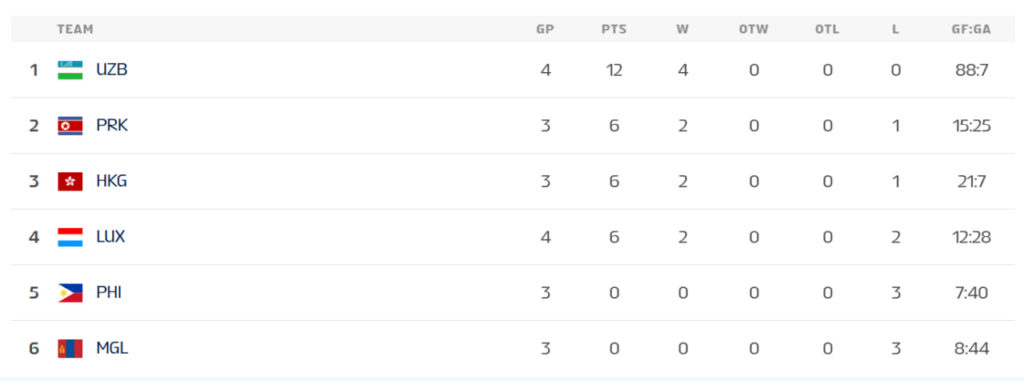 O‘zbekiston terma jamoasi mazkur turnirda sermahsul hujumkorlik qayd etib, eng ko‘p shayba kiritgan jamoa bo‘lib turibdi. Avvalgi turlarda jamoa Filippin terma jamoasini 28:3, Koreya Xalq Demokratik Respublikasi (KXDR) jamoasini esa 20:3 va Mo‘g‘uliston termasini esa 26:1 hisobida mag‘lub etgan edi. Natijada, yuz foizlik g‘alaba va umumiy 88:7 to‘plar farqi bilan ustunlik ta’minlandi.