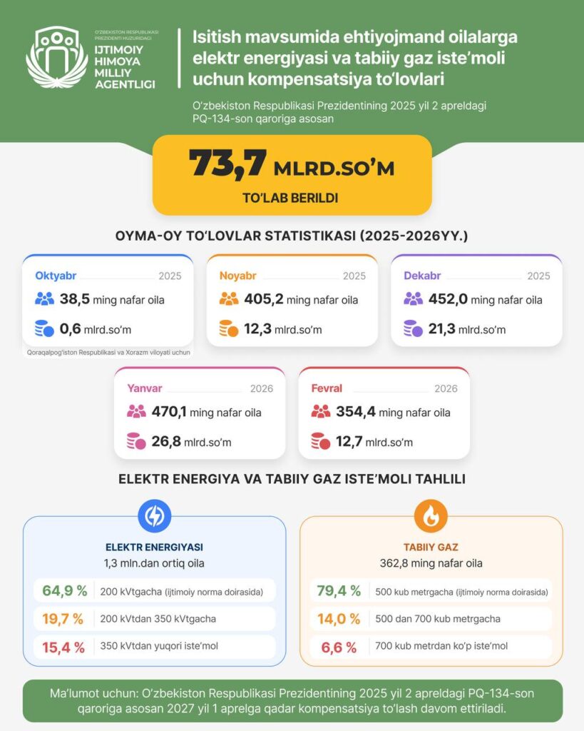 Isitish mavsumida ehtiyojmand oilalarga elektr va gaz uchun jami 73,7 mlrd so‘m kompensatsiya to‘lab berildi. Bu haqda Ijtimoiy himoya milliy agentligi xabar berdi.