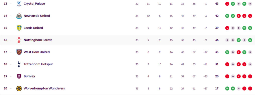 «Lids Yunayted»ga qarshi uchrashuvda 3:0 hisobida imkoniyatni boy bergan «Vulverxempton» hisobida bor-yo‘g‘i 17 ochko mavjud. Mavsum yakuniga qadar yana 5 ta o‘yin qolgan bo‘lib, jamoa qolgan barcha uchrashuvlarda g‘alaba qozongan taqdirda ham eng ko‘pi bilan 15 ochko to‘plashi va umumiy ochkolari sonini maksimal 32 taga yetkazishi mumkin, xolos.