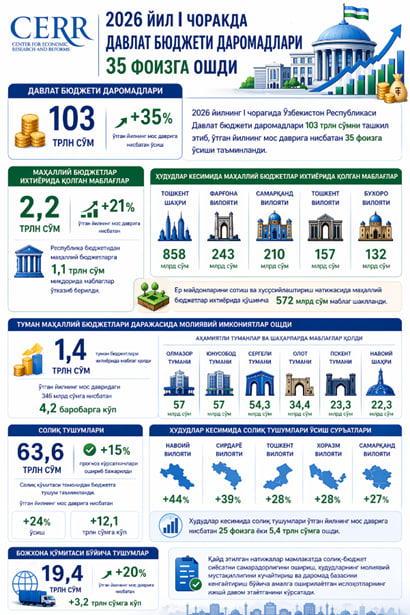 2026-yilning birinchi choragida O‘zbekiston davlat budjeti daromadlarida barqaror o‘sish kuzatildi. Iqtisodiy tadqiqotlar va islohotlar markaziga ko‘ra, hisobot davrida daromadlar 103 trln so‘mni tashkil etdi va o‘tgan yildagiga nisbatan 35 foizga oshdi.