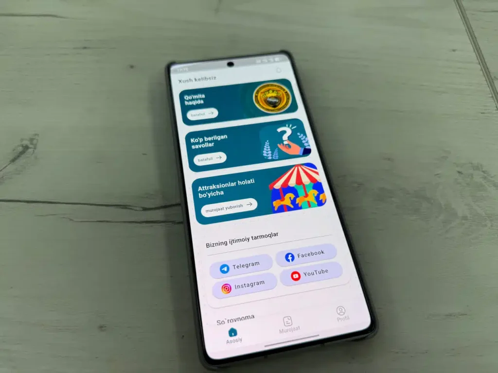 Ushbu ilova yordamida texnik nosoz yoki shubhali attraksionlar joylashgan viloyat, tuman va bog‘ nomini tanlab, onlayn murojaat yuborish tizimi joriy etilgan.