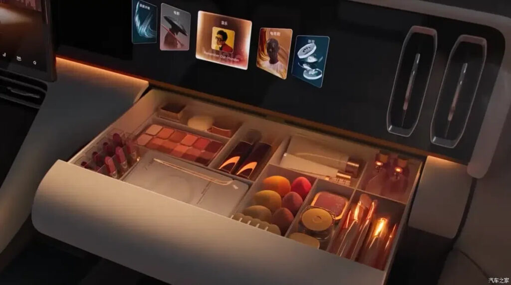 Interyerda dizayn detallari tabiatdan ilhomlangan. O‘rindiqlarda landshaft uslubidagi bezaklar bor. Markaziy konsolda kristall shaklidagi boshqaruv tugmasi joylashgan. Orqa qismda katta ekran va buklanadigan stolchalar mavjud. Avtomobil 2+3+2 joylashuvga ega bo‘lib, 7 o‘rinli konfiguratsiyani taklif qiladi.