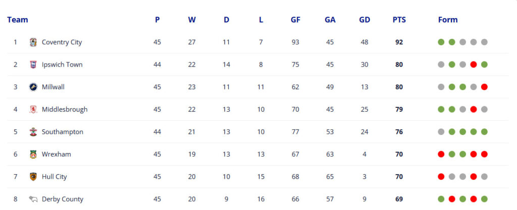 Ma’lumot uchun, Chempionshipda 46 ta tur yakunlangach 3 – 6-o‘rinlarni egallagan jamoalar Premyer-ligaga chiqish uchun qo‘shimcha pley-off o‘yinlarida ishtirok etadi.