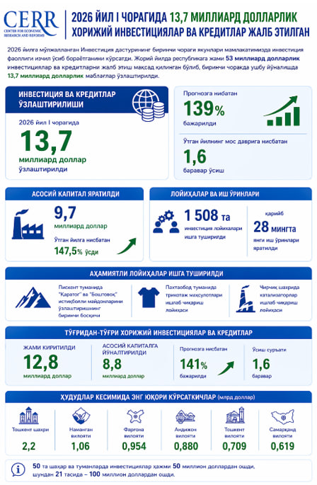 2026-yilning birinchi choragida Oʻzbekistonga kiritilgan investitsiyalar hajmi $13,7 mlrdga yetdi. Bu oʻtgan yilga nisbatan 1,6 barobar koʻpdir. Bu haqda Iqtisodiy tadqiqotlar va islohotlar markazi (ITIM) ma’lum qildi.