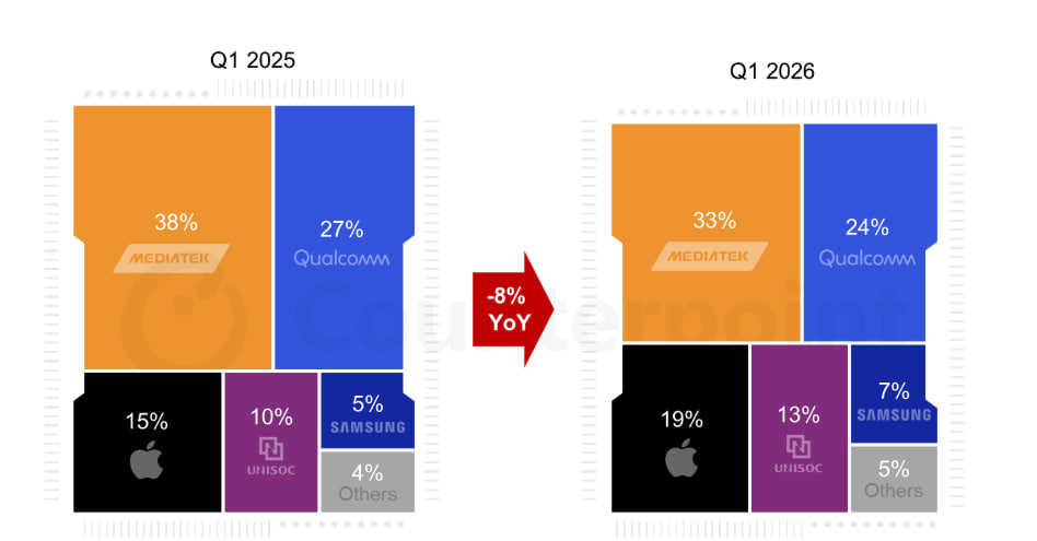 Hisobotga ko‘ra, 2026-yilning birinchi choragida global smartfon protsessorlari yetkazib berish hajmi 8 foizga kamaydi. Tahlilchilar bunga asosiy sabab sifatida xotira tanqisligini ko‘rsatmoqda. Bu holat ishlab chiqaruvchilarni yangi mahsulotlarni kechiktirishga va xarajatlarni kamaytirishga majbur qilmoqda.