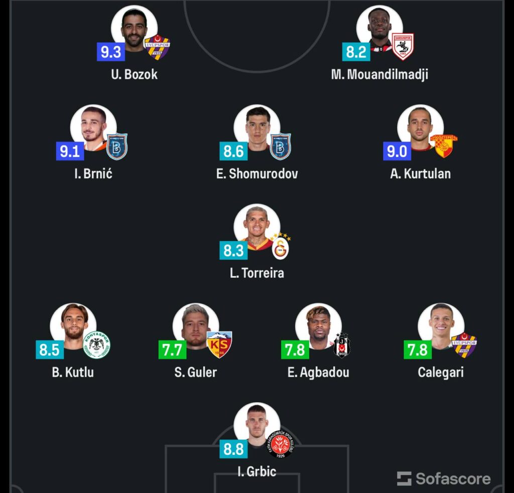 Ramziy jamoadan Shomurodovning jamoadoshi Ivan Brnich va «Galatasaroy» yarim himoyachisi Lukas Toreyra ham o‘rin oldi. Shuningdek, «G‘oztepe» vakili A. Kurtulan va «Eyupspor» a’zosi Umut Bozok ramziy jamoaning hujumkor chizig‘ini tashkil etgan.