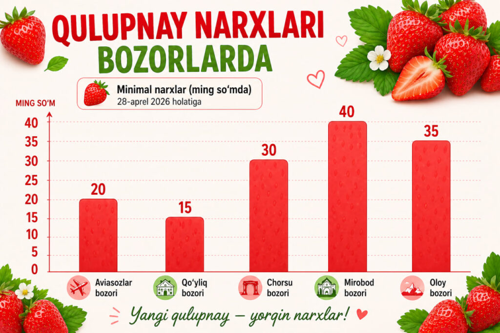 Eng arzon qulupnayni hozirda Qo‘yliq bozoridan topish mumkin. Bu yerda narxlar 1 kg uchun 15 ming so‘mdan boshlanadi, yirikroq hajmdagilari esa 25 ming so‘m turadi.