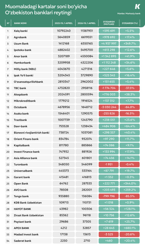 Shu bilan birga, O‘zmilliybank (NBU) 6-o‘rindan 7-o‘ringa tushib ketdi. Garchi moliya muassasasi o‘sish qayd etgan bo‘lsa-da (+227 ming karta, jami 4,27 mln), 5,6% lik sur’at o‘rtacha bozor ko‘rsatkichlaridan past bo‘lib chiqdi.