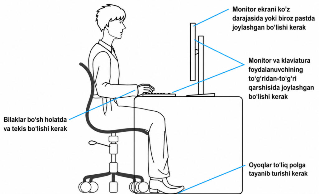 Ish joyini tashkil etishda bir nechta muhim qoidalarga amal qilish tavsiya etiladi. Avvalo, monitor ko‘z darajasidan biroz pastroqda joylashishi kerak. Bu holatda ko‘z tabiiyroq holatda bo‘ladi va mushaklar ortiqcha zo‘riqmaydi. Ekran bilan ko‘z orasidagi masofa esa odatda 50–70 santimetr bo‘lishi lozim. Juda yaqin masofa ko‘zni zo‘riqtiradi, juda uzoq masofa esa diqqatni jamlashni qiyinlashtiradi.