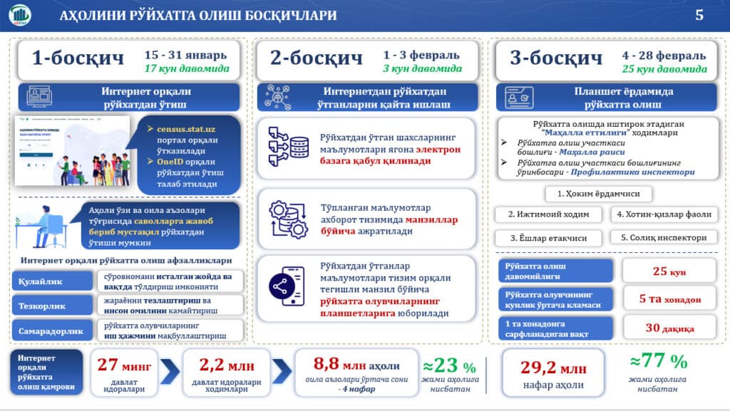 - Iqtisodiy boshqaruv va bandlikni ta’minlash. Ro‘yxat olish natijalari mehnat bozorini baholash, hududlar salohiyatini aniqlash va yangi ish o‘rinlarini yaratish imkonini beradi.