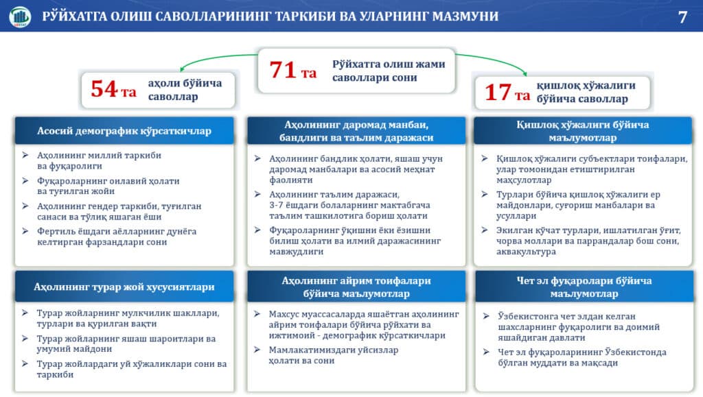 Aholi va qishloq xo‘jaligini ro‘yxatga olish jarayonidagi so‘rovnoma 71 savoldan iborat bo‘lib, 54 tasi aholiga, 17 tasi qishloq xo‘jaligiga oid.