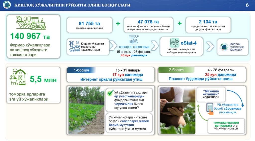 Qishloq xo‘jaligini ro‘yxatga olish jarayoni 15-yanvardan 28-fevralgacha, jami 45 kun davom etadi va elektron savolnoma orqali eStat-4 avtomatlashtirilgan axborot tizimi yordamida amalga oshiriladi. Jarayon ikki bosqichdan iborat: 1-bosqichda (15–31-yanvar) internet orqali ro‘yxatdan o‘tiladi, 2-bosqichda (4–28-fevral) esa planshetlar yordamida, «mahalla yettiligi» xodimlari ishtirokida uyma-uy so‘rovnoma o‘tkaziladi.
